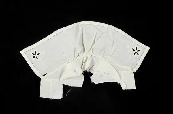 b: Längd: 40 cm. Höjd: 12,5 cm - kraghöjd. Material: Textil, bomull. Teknik: Tuskaft. Broderi, enkel utdragssöm. Handsömnad.