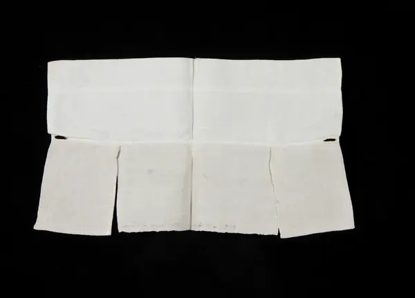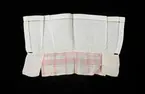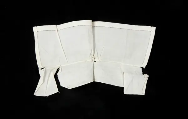 d:Längd: 45 cm. Höjd: 14 cm - kraghöjd. Material: Textil, bomull. Textil, linne - bröstlappar och bakstycke. Teknik: Tuskaft. Korssöm - märkning. Handsömnad.