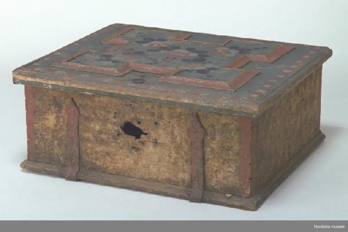 Inventering Sesam 1997-1998: B 50,5, Djup 43, H 21,5 cm Skrin, rektangulärt, med fällock, av barrträ. Utanpåliggande botten fästad underifrån med spikar av järn, fotlist. Sidorna ihopfogade genom sinkning. Två spetsformade järnbeslag på framsidan, fästade runt bottenkanten. Lock med skurna profillister, fästade i tappar samt med trädymlingar på kortsidorna, profilerad framkant. Två bandgångjärn, spetsformade, fästade på lockets insida samt på baksidan runt bottenkanten. Lås och nyckel saknas, ett hål i framsidan efter låset, ett stycke av låset sitter kvar på kanten samt låssprinten i locket. Spegel med listverk på locket, geometrisk rätvinklig form som täcker en stor del av locket. Framsidan och gavlarna målade i gul-brunt spräckligt mönster, röda hörn och beslag, baksidan helt omålad. Locket målat i blått, listverk i rött, spegeln har blomdekor i mörkblått, rött och vitt, prickbård i rött och vitt runt kanten. Läddika med kontursågad sida vid gaveln. Invändigt klätt på sidorna med mönstrat papper (tapet?), grönaktiga blommor och blad på mörk botten, även blad ur en religiös skrift sitter limmade framförallt på botten, trasiga blad ligger löst. Lockets insida vitmålad, i svart " ANO 1773 ". Jmfr. N. Keylands handlingar h.2. Inköpt under fil.kand. N. Keylands resor i Värmland 12/11 1898-31/12 1899. Agnetha Blomberg 1998