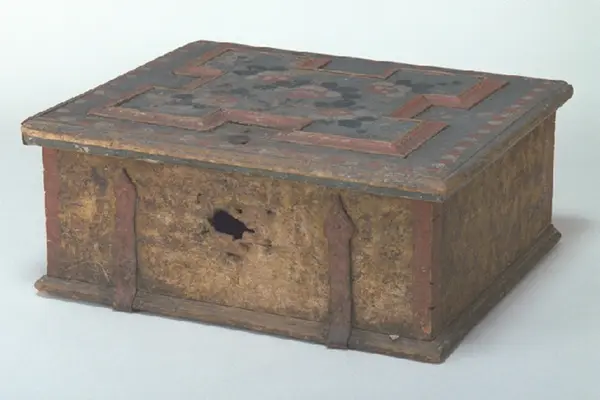 B 50,5, Djup 43, H 21,5 cm Skrin, rektangulärt, med fällock, av barrträ. Utanpåliggande botten fästad underifrån med spikar av järn, fotlist. Sidorna ihopfogade genom sinkning. Två spetsformade järnbeslag på framsidan, fästade runt bottenkanten. Lock med skurna profillister, fästade i tappar samt med trädymlingar på kortsidorna, profilerad framkant. Två bandgångjärn, spetsformade, fästade på lockets insida samt på baksidan runt bottenkanten. Lås och nyckel saknas, ett hål i framsidan efter låset, ett stycke av låset sitter kvar på kanten samt låssprinten i locket. Spegel med listverk på locket, geometrisk rätvinklig form som täcker en stor del av locket. Framsidan och gavlarna målade i gul-brunt spräckligt mönster, röda hörn och beslag, baksidan helt omålad. Locket målat i blått, listverk i rött, spegeln har blomdekor i mörkblått, rött och vitt, prickbård i rött och vitt runt kanten. Läddika med kontursågad sida vid gaveln. Invändigt klätt på sidorna med mönstrat papper (tapet?), grönaktiga blommor och blad på mörk botten, även blad ur en religiös skrift sitter limmade framförallt på botten, trasiga blad ligger löst. Lockets insida vitmålad, i svart " ANO 1773 ".