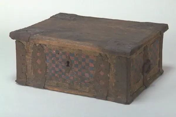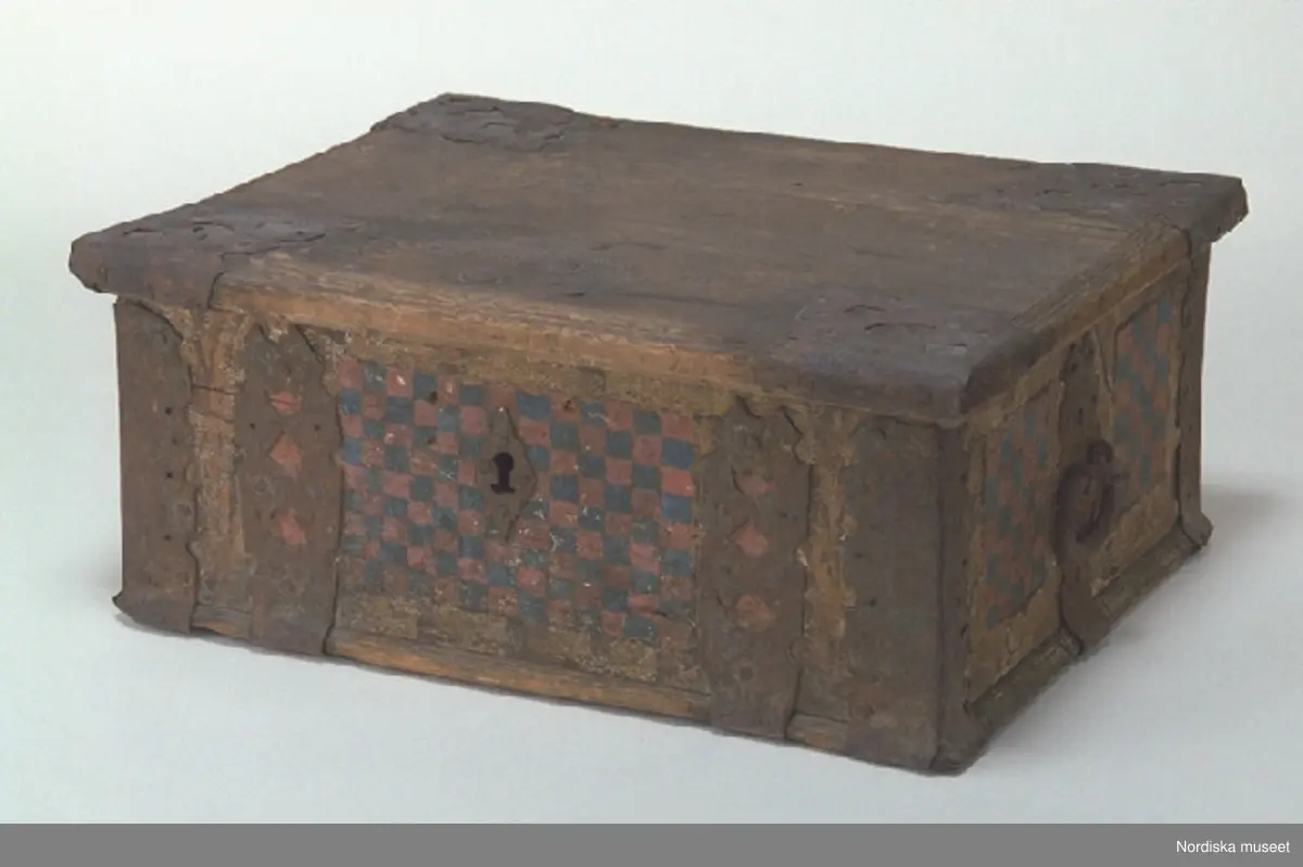 B 52, Djup 42, H 22 cm Skrin, rektangulärt, med plant fällock, av barrträ. Utanpåliggande botten, fästad underifrån med dymlingar av trä samt spikar av järn, fotlist. Järnbeslag runt hörnen. Lock med skurna profillister, fästade på gavlarna med trädymlingar, profilerad framkant, järnbeslag med utstansade mönster i hörnen. Två bandgångjärn, spetsformade, fästade på lockets insida samt på baksidan runt bottenkanten. Två spetsformade järnbeslag med utstansat mönster på framsidan, fästade runt bottenkanten. Järnbeslag med bygelhandtag av järn på ena gaveln, beslag på andra gaveln där handtaget fattas, beslagen fästade runt bottenkanten. Lås och nyckel saknas, låssprint av järn i locket, nyckelskylt av järn. Målat i gult och brunt marmorerat mönster, färgen nött och på lockets ovansida saknas helt färgen, framsidan och gavlarna med rutiga fält i blått och rött. Lockets insida målad i vitt med märkning i svart " Jacob Jacobsson Biurbäcken 1771 ", otydlig skrift med rödpenna nedanför märkningen. Sprickor i botten och lock.