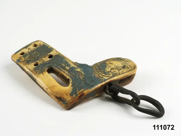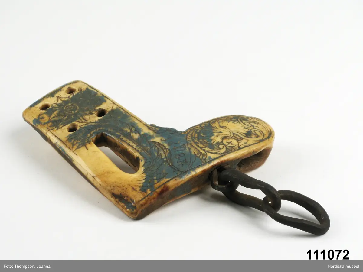 Katalogkort: "Selknä. Af ren eller elghorn. Härjedalen? Graverad åtsida med 16D87 MNärla och två ovala lånkar af järn. Åtsidan prydd med löfverk, en rosett mm. Spår af blå målning. Spetsen ofvan järnmärlan genombruten från kanterna af ett långsmalt hål. Förvärf vid norska gränsen. Inköpt 1908 5 kr. P.G.W [signatur för person som skrivit katalogkortet.]" Svartvit foto på katalogkortet.