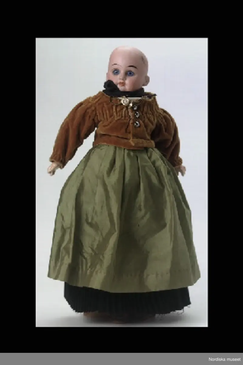 H 35 cm Damdocka (a.) med vridbart huvud av rosa biskvi, ledad kropp av rosa målad massa. Ansikte med röd öppen mun med tänder, ögon av glas med blå iris och svart pupill, målade ögonfransar och ögonbryn, hålighet i huvudet där peruken skall fästas, rester av lim och brunt hår. Klädd i folkdräktslik dräkt: b.) gyllenbrun sammetsjacka, midjekort med rosa foder, knäpps med fyra hyskor, på framsidan tre metallknappar. c.) lång, svart, plisserad/goffrerad kjol av ull. d.) långt förkläde av grönt siden. e.) röd underkjol av ullfilt med vågig nederkant. Rejält skadad av skadedjur. f.) blusliv av vit bomull med spetskant i halsringningen och ärmslut, knytband. g.) mamelucker av vit bomull med spetskant. h.) särk av vit bomull, öppning i fram med knapp, spets i halsringningen, ärmhål och nederkant. i.) ett par knästrumpor av brun bomull eller ull. j 1-2.) ett par skor av brunt skinn med snörning och metallspänne. k.) halsband, treradigt med mässingspärlor och lås med pärla. l.) skarf av svart siden. Märkt på huvudets baksida: " 1894/AM 3/0 DEP/ Made in Germany", tillverkad av AM= Armand Marseille i Tyskland, modell 1894, registrerad modell= DEP. Storlek 3/0. Eventuellt inköpt i Salzburg, Österrike.