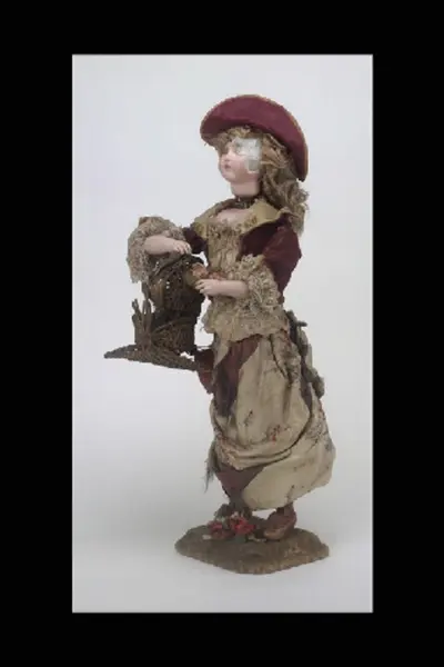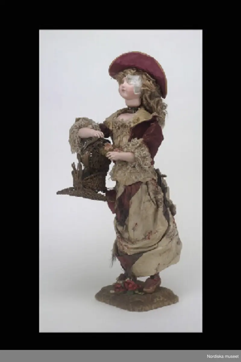 Huvudliggaren: "Speldosa, fågelhandlerska, docka i sammetsliv och sidenkjol, korg med en fågel, på platta klädd med sammet, huvudet trasigt, anv. i skyltfönstret på Storkyrkobrinken. Gåva 20/11 1933 av fröken Dagmar Landelius, Stockholm." Bilaga: "En samling föremål från Landelius Kungl. hovkonditori, Storkyrkobrinken 9, Stockholm [...] Givarinnans morfar, J. C. Landelius, öppnade 1858 affären på Storkyrkobrinken. På 1860-talet öppnade samma firma den s.k. paviljongen på Drottningholm, vilken ombyggdes 1903. Affärsrörelsen på Storkyrkobrinken drevs till 1910, då huset skulle rivas, varför huvudaffären flyttades till Strandvägen 7A samt en filial till 16 Storkyrkobrinken. I den gamla affären skyltades med två speldosor (nr 194.909 och 194.921), samt en hare, som spelade på trumma, och en docka (194.921), vilken kläddes i olika dräkter efter årstiderna och samma docka hade även en sorgdräkt från 1870-talet, vilken användes vid kungssorg. Slottet gjorde alla sina beställningar hos Landelius. Den 24 januari var det oftast bjudning med minst 1 000 karameller beställda. Drottning Sophia beställde Jesusbarn med gloria till småprinsessornas julgran samt tomtar och dylikt. Senare flyttade kronprinsparet över sina beställningar till annan firma, men de övriga kungliga gjorde fortfarande sina inköp hos Landelius, liksom flera andra större restauranger. I det s.k. 'änglaskåpet' i affären [...] förvarades små figurer av dragant förfärdigade av fröken Beda Pegel, Karlavägen. Hon gjorde stora figurer till krokaner, begravningsföremål såsom biblar, kors och lamm etc. och till flyttgröt, tomtar med grötfat, samt till barndop lindebarn burna av storkar. Från Paris tog man hem diverse små prydnadssaker till karameller. Firman Lumarier hade små verkstäder för olika material; vax, metall och bensaker allt utfört för hand. Små soffor och biljarder av ben lades som överraskningar i påskäggen. Alla karameller inlades i affären och pryddes på olika sätt: svanen lades på en spegel med gräskant osv. Även efterrätter beställdes och om man t.ex. önskade ett lapplandskap gjordes kåtan av bakverk med snöbollar av spunnet socker medan renen och lapparna voro skurna i trä och återtogs dagen därpå. Denna efterrätt var synnerligen omtyckt på 1890-talets början." Inventering Sesam 1996-1999: Speldosa, docka, fågelhandlerska. Huvud och armar av biskvi (huvudet mycket trasigt). Kropp av massa. Blont hår (peruk) av mohair. Stående på fyrkantig bottenplatta klädd med mönstrad grön sammet. Dockan iklädd hatt av strå fodrad med lila siden, gröna och konstgjorda växter på hatten. Klänning av ljust mönstrat siden och vinrött sammet, Gul krage och isättning fram, vita spetsar vid ärmslut och urringning. Bruna skor av träskomodell. På höger arm en korg med lock. I korgen fågelbo med bl a gröna konstgjorda växter och uppstoppad fågel (mycket maläten). I handen håller dockan en grön kvist och rosa blommor. Lös bukett (troligen fäst på dockan ursprungligen) med röda och vita rosor. I ryggen sitter en nyckel och i vänster sida en stav med knopp av gulmetall för av- och påslagning. Dockan kan spela två musikstycken (se nedan) och rör samtidigt på vänster arm och nickar med huvudet. Korgens lock öppnas och den lilla fågeln rör på huvudet och piper ibland. Speldosan fungerade vid inv. 1998. Under fotplattan etikett med text "La Mascotte, Valse" (=lyckoflickans vals) och "Les noces de Jeanette, Romance" (=Jeanettes gifterål). La Mascotte är en operette skriven av Audran, 1880 och Les Noces de Jeanette en operett skriven av Mass¿ 1853. Inskrivet i en oval finns också bokstäverna "BP". BP kan ev vara tillverkaren (okänd) eller någon återförsäljare. Har använts som skyltdocka i konditori på Storkyrkobrinken 9, Stockholm, innehavare Hovkonditor J C Landelius. Mycket från konditoriet är skänkt till Nordiska museet. Jmfr t ex inv.nr 194.921. Jmfr liknande speldosa av samma tillverkare (?) inv.nr 241.509 /Leif Wallin feb 1998