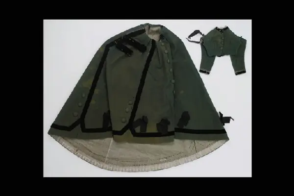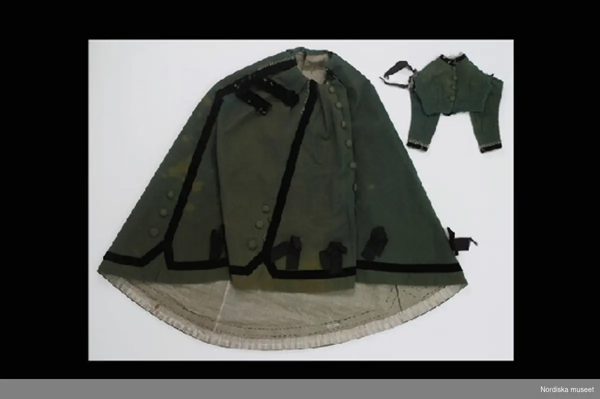 "Klänning, a) liv b) kjol, grön rips, garnerad med svarta sammetsband och sidenrosetter, gröna överklädda knappar c) skärp, svart sammet med paljetter; dockans (194.921) troligen ursprungliga klänning. Gåva 20/11 1933 av fröken Dagmar Landelius, Stockholm."