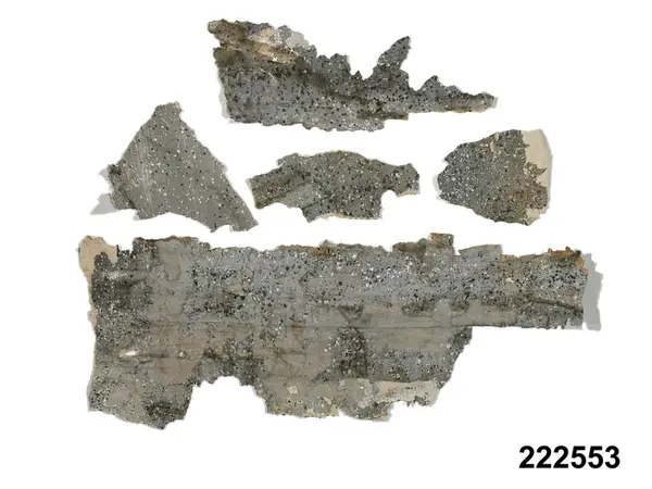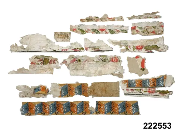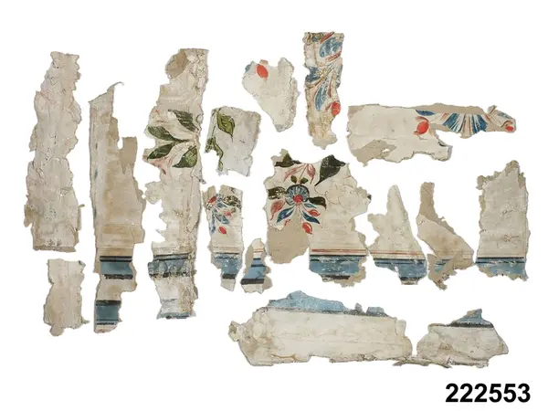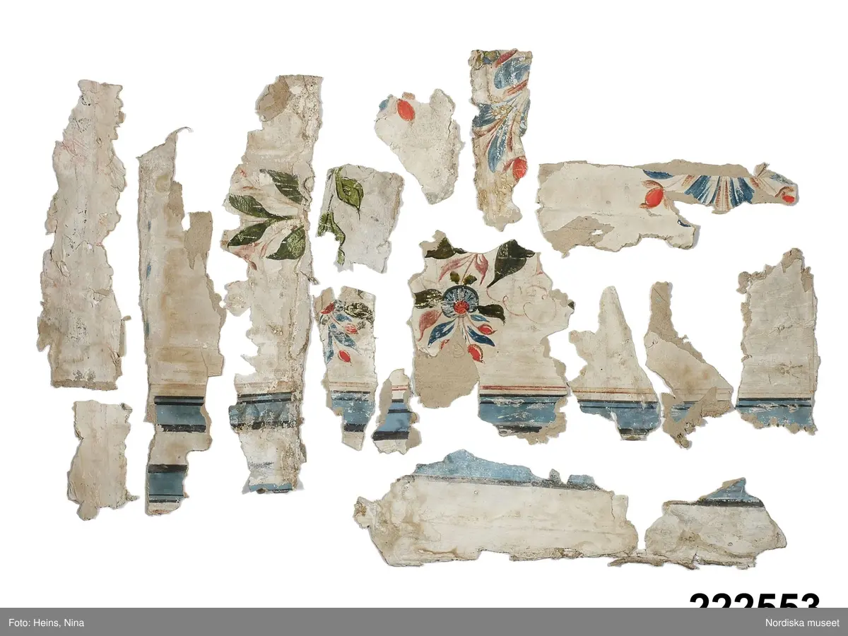 Tapetfragment, totalt 36 delar, av olika typ. 16 av dessa målade med kurbitsmotiv och ränder övervägande i blått, men också med rött, grönt, svart och vinrött på vit botten, grovt papper. 15 delar med kurbitsliknande blommor och blad målade i grönt, rött och violett mot vit botten. Vissa delar med bård, målat veckat band i blått och orange med svarta och vita stiliserade blommor ovanpå, ockrafärgad bakgrund. Fem stycken är stänkmålade med limfärg på grovt papper, svart och vitt mot grå botten.