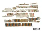 Tapetfragment, totalt 36 delar, av olika typ. 16 av dessa målade med kurbitsmotiv och ränder övervägande i blått, men också med rött, grönt, svart och vinrött på vit botten, grovt papper. 15 delar med...
