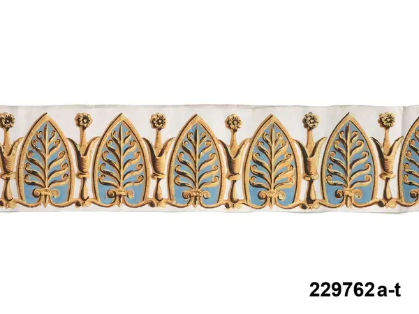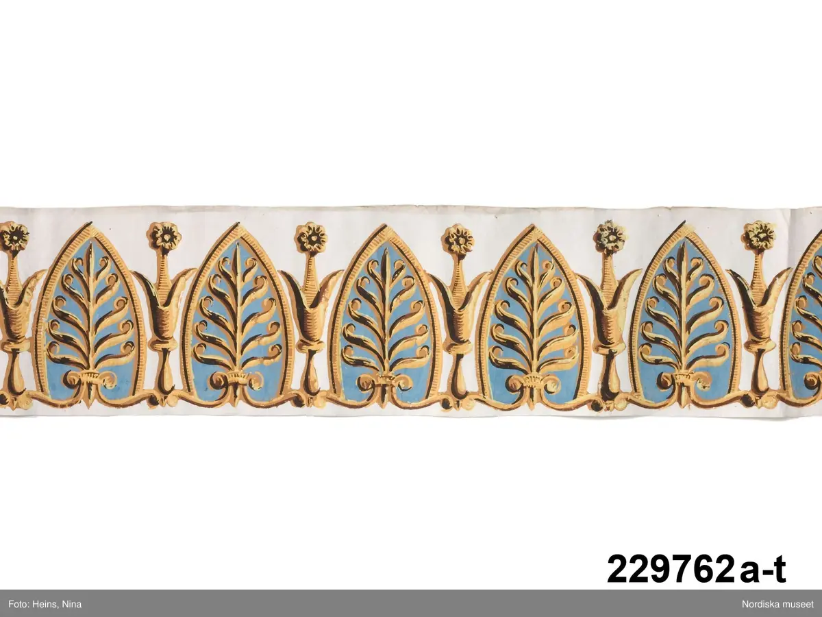 "a-t Tapetbård, 20 st., papper med tryckt dekor, stående spetsig oval med palmettmotiv; ljusblå botten i ovalen, guldgult ockra, brunt och svart i palmett, ovalen ockra, brunt och svart och gult. Emellan stilis. blommor i föreg. färger, botten vit. Namnst. i oval. Br. 17 cm. Ingår i en samling tapeter, som sedan långt tillbaka förvarats i museet"