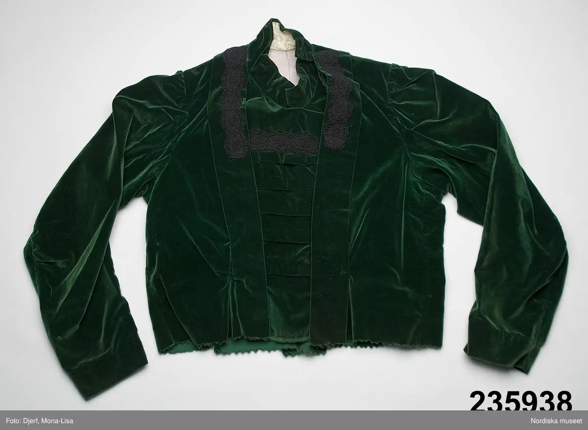 • Liv till en 2-delad klänning eller möjligen bara en blus som burits till annan kjol. Av mörkgrön bomullssammet i modesnitt från omkr. 1900 men utan de insydda stålfjädrar som då var vanliga. Sydd på foderstomme av grå bomullslärft. 2 framstycken med ett djupt längsgående veck på var sida om en tvärveckad fastsittande isättning. På vecken samt tvärs över isättningen applikation av svart maskingjor... Visa hela