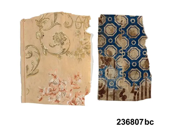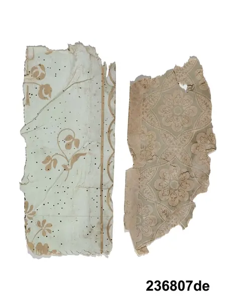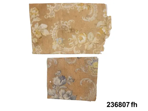 "a-h Tapetprov, 8 st., av papper, med tryckt dekor, från Stengrinda, Hellvi, i stenhus från 1800-talets början. I huset var vid sekelskiftet köket limfärgat med blomdekor. Se E.U. 40.427."