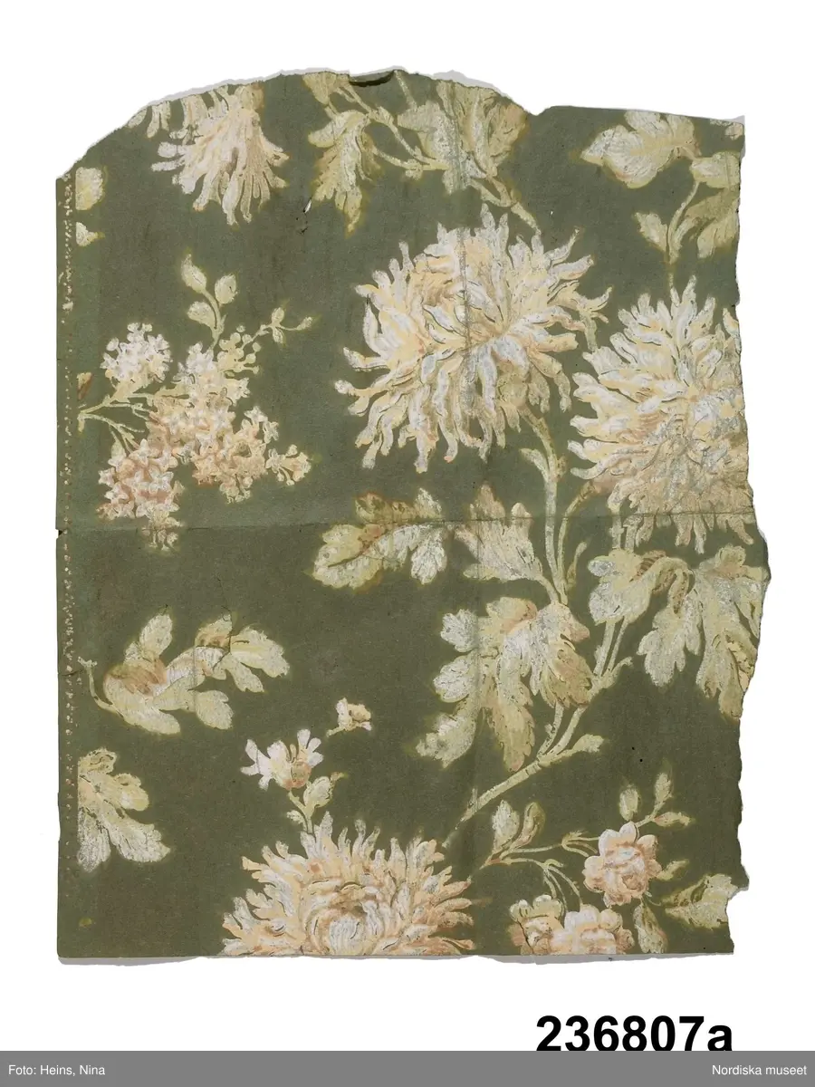 a) Mörk olivgrön botten med astrar i ljusgult, vitt och rosabrun. Passmärken i marginalen. Stämpel samt handskrift på baksidan