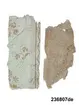 b) Naturell beigebrun botten. Dekor av tryckat rosa blommor samt grågula volutformationer. Marginal. Otydbar hanskrift på baksidan.