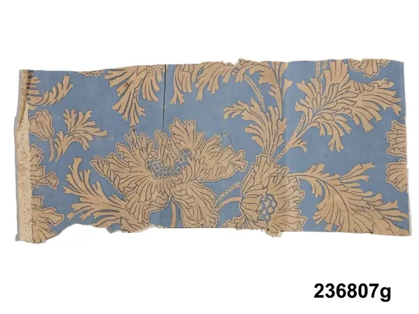 g) Ljusblå botten. Dekor av blomma utsparad i papprets naturella beiga färg. Passmärken i marginalen.