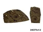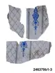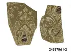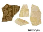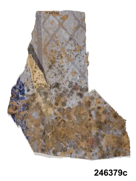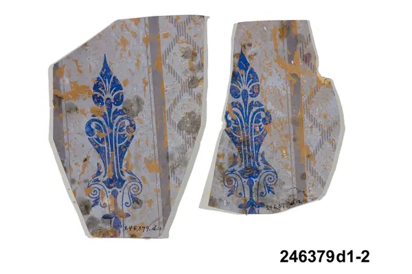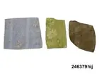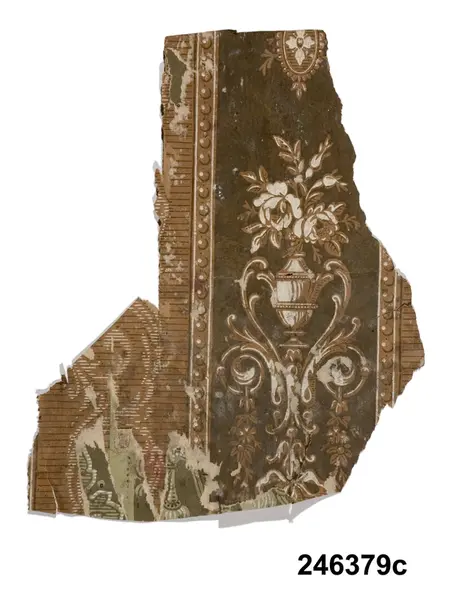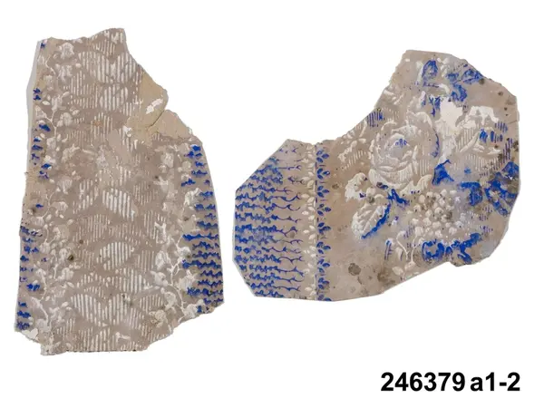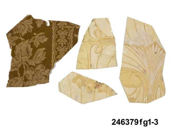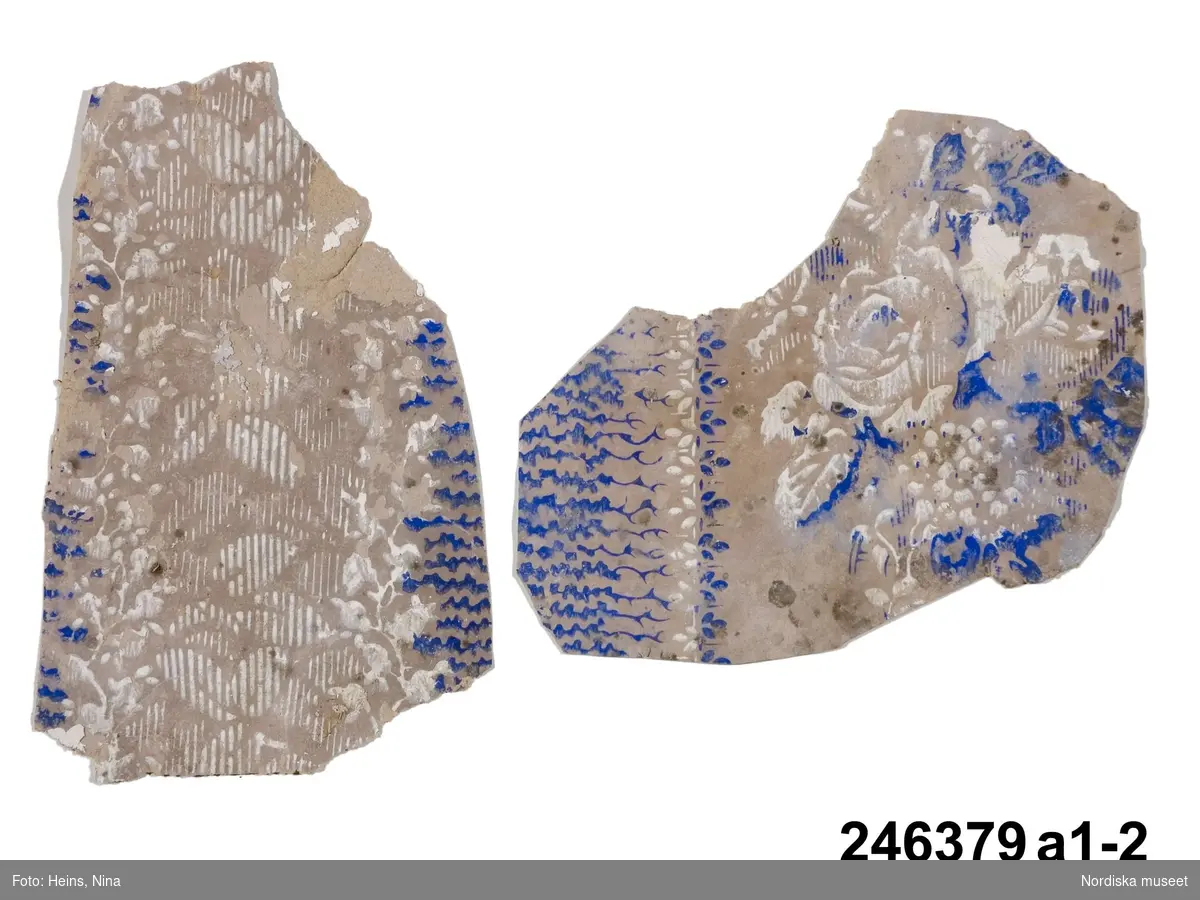 Huvudliggaren: "a-j Tapetprover, 10 st., tryckta på papper. Har varit uppsatta i följd i ett rum på Höga gård, e) enl. uppgift trol. 1876, j) 1930. Under a) satt en handmålad tapet." Bilaga: Tidningsartikel om den handmålade tapet på Höga i Hälsingland som återfunnits under tapetproverna med inv nr 246.379 och 246.380. a:1-j) Tapetprover och fragment, 18 stycken. a:1-a:2) Två fragment med tryckta, vertikala bårder; rosor och blad respektive vågmönster med små stiliserade blad. I vitt och koboltblått mot papperets bruna färg. a:1 L. 16, B. 18 cm., a:2 L. 21, B. 13 cm. Anm.: a:1 med fläckar och veck, a:2 med fläckar och reva. b:1-b:4) Fyra fragment, tryckt vertikalindelat mönster; omväxlande diagonalrutor i grått med inskrivet vitt blomornament, omväxlande stiliserat avlångt ornament i koboltblått, ljusgrå bakgrund. b:1 L. 16, 5, B. 32 cm. b:2 L. 25, B. 16 cm. b:3-b:4 L. 24, B. 13 cm. (dessa sitter delvis sammanklistrade) c) Tryckt mönster med vertikal indelning. Omväxlande blomsterurnor med nedhängande blomgirlang, omväxlande ornament mot horisontallinjer. Vitt och mörkbrunt mot papperets bruna färg. L. 31, B. 25 cm. Anm.: Revor, fläckar. d:1-d:2) Tryckt mönster med blomsterornament i grönbeige, vitt och svart mot gråbrun bakgrund. d:1 L. 21, B. 14 cm. d:2 L. 19, B. 13 cm. Anm.: d:1 med litet hål och slitage, d:2 med reva och fläckar. e:1-e:2) Tryckt mönster med snirklande blom- och bladornament i svart och guld mot brun bakgrund. e:1 L. 25, 5, B. 17 cm., e:2 L. 11, B. 16 cm. Anm.: e:1 med hål, färgbortfall och vikmärke, e:2 med vikmärke. f) Mönster med blommor omväxlande med vertikal bård. Beige och guld mot brun bakgrund. L. 18, B. 18 cm. Anm.: Reva. g:1-g:3) Tryckt mönster med linjer och blommor, i ljusgult, beige och vitt. g:1 L. 21, B. 12 cm., g:2 12, 5 x 10 cm., g:3 L. 8,5, B. 14 cm. Anm.: g:1 med hål, g:2 med revor och g:3 med fläckar. h) Tryckt, vävliknande mönster med blommor (prästkragar) i olika gröna nyanser. L. 22, B. 15 cm. i) Sirligt, vertikalt spetsmönster i vitt med ovanpåliggande rosenbuketter och spridda rosor i vitt och blekrosa med gröna blad. Blekt gråblå bakgrund. L. 22 cm., B. 27 cm. Anm.: Fläckar, veck, nålhål. j) Fint, glest mönster med stiliserade blommor - endast dragna linjer - stjälkar i svart och kronblad i guld samt streckdekor i brunt och svart. Gråbrun bakgrund. L. 24 cm., B. 19 cm. /Marie Tornehave 2007-08-27