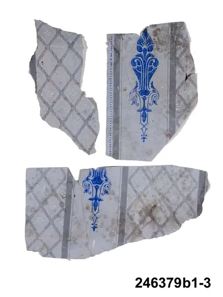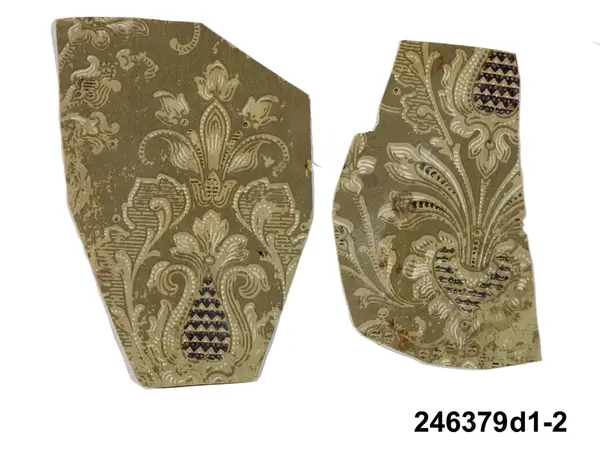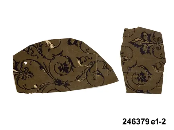 Huvudliggaren: "a-j Tapetprover, 10 st., tryckta på papper. Har varit uppsatta i följd i ett rum på Höga gård, e) enl. uppgift trol. 1876, j) 1930. Under a) satt en handmålad tapet." Bilaga: Tidningsartikel om den handmålade tapet på Höga i Hälsingland som återfunnits under tapetproverna med inv nr 246.379 och 246.380. a:1-j) Tapetprover och fragment, 18 stycken. a:1-a:2) Två fragment med tryckt...