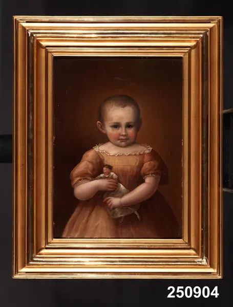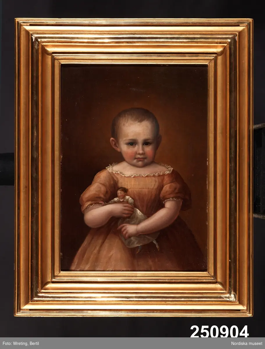 Katalogkort: "HL: 'porträtt av en liten flicka, enl. uppgift Mariana Albertina Hammer (1867-1950), olja på duk, 3/4-porträtt i skär klänning med docka i hanaden, på baksidan övermålad inskrift; profilerad, förgylld ram." Pendang till 250903. Troligen har Carl P Lehman målat porträttet. En lapp skriven på baksidan: 'Detta porträtt föreställer min farmors syster Marianne Hammer (1866-1950) Stockholm...
