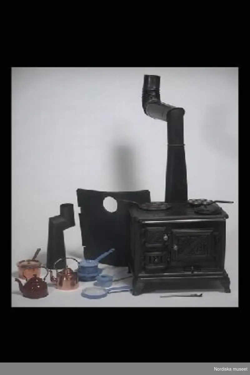 L 37,5 B 30,5 H 31 (cm) Leksaksspis (a+) för vedeldning, av gjutjärn, fält med vegetativt mönster och meanderbård på front och sidor, rektangulärt liggande form på fyra svängda fötter, häll med tre kokplattor, spisten, löstagbara ringsatser, öppningsbar eldstadslucka, asklucka, stekugn och sotlucka, på fronten ingjutet fabriksmärke "HUSQVARNA No 2". Tillhörande spiskrok, tredelat skorstensrör med separat skyddsplåt samt bakplåt och långpanna (a+). Tillhörande kokkärl: b) Munkpanna av gjutjärn. c) Plättlagg av gjutjärn. d+) Roterande våffeljärn av gjutjärn, med fals och två hänklar. e) Stekpanna av emaljerat gjutjärn, utvändigt blått, invändigt vitt. f+) Stor kastrull med fläns och lock, av emaljerad plåt, utvändigt blå, invändigt vit. g+) Liten kastrull som ovan, utan fläns. h+) Kastrull med lock, av koppar, invändigt förtent, handtag och lockknopp av mässing. i+) Kaffepanna med lock, av koppar, invändigt förtent. j+) Kaffepanna med lock av emaljerad plåt, utvändigt brun, invändigt vit. Har tillhört givarinnan och använts av henne vid 1900-talets början.