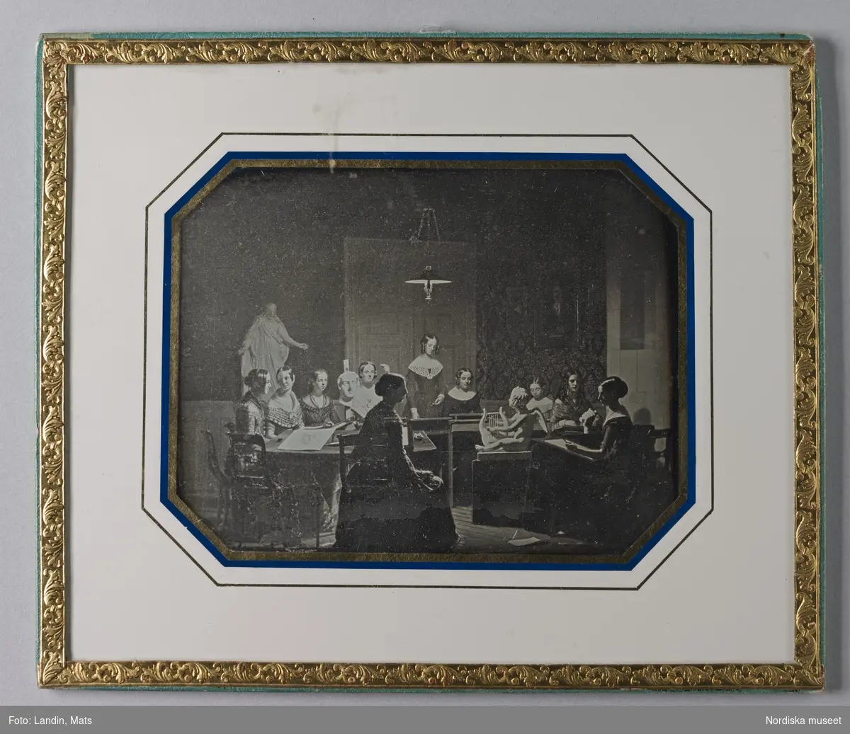 Dagerrotypi i ram, interiör med pulpeter, stolar och tio unga kvinnor. Kvinnan i mitten står upp, de andra sitter ned, några ritar. Mitt bland bänkarna en staty av en putti med harpa, i bakgrunden staty av Jesusgestalt med utbredda armar. Ovanför gruppen tänd taklampa, i bakgrunden ljus dubbeldörr, ljus hög golvlist och mörk medaljongmönstrad tapet. Porträtt med bred ram hänger mot tapeten. Längst till höger vit kakelugn.