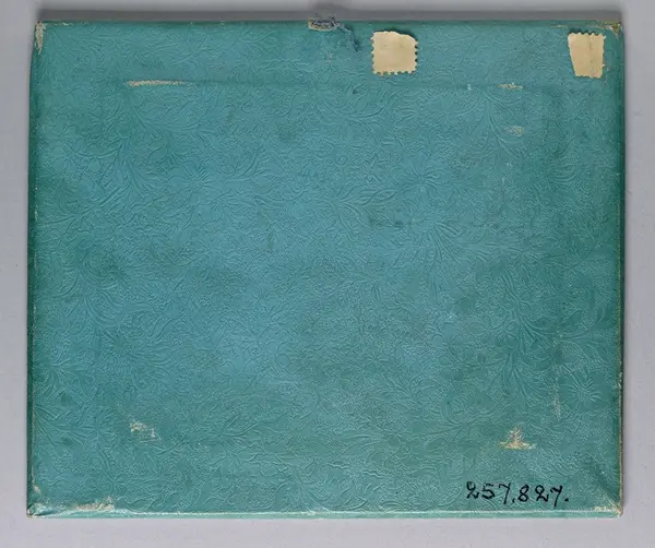 Helt glasad ram. Passepartout av vitt papper med åttkantig dagöppning med en blå linje samt guldlinjer närmast bilden. Kantlist av mönsterpressat, förgyllt papper. Bakstycke av turkost papper med pressat blommönster. I mycket gott skick.