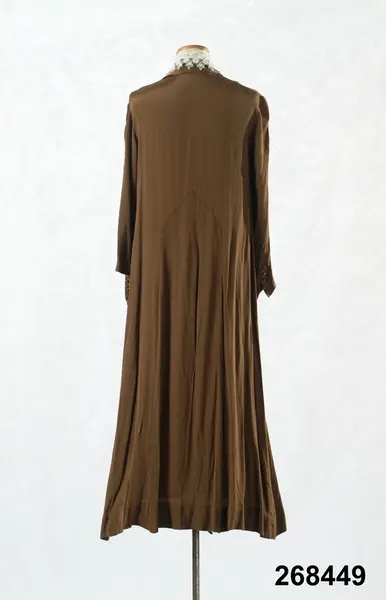 Helskuren rak klänning av brunt konstsilke s.k. crèpe de chine, sydd i modesnitt från 1930-talet. Ett bakstycke med en infälld smal våd som slutar i en snibb mitt i ryggen. Framstycket skuret likadant med infälld snibbig mittvåd samt bystinsyningar både från sidan och från axeln. Nedliggande krage med spetsiga snibbar tagen med den blanka avigsidan utåt, sprund fram 30 cm långt med 15 st små ty...