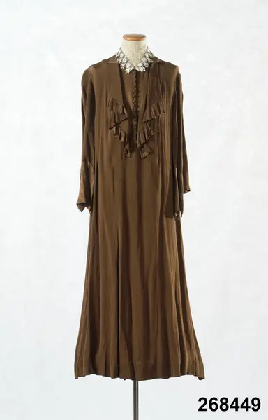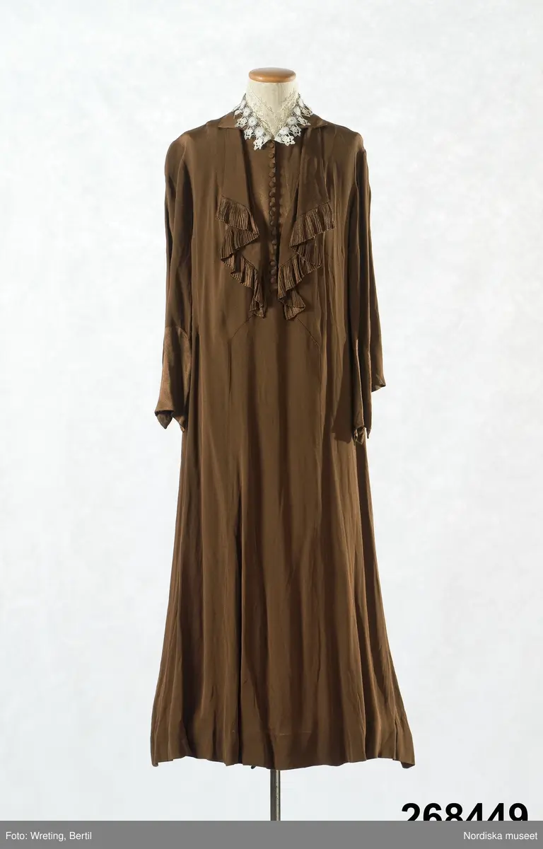 Helskuren rak klänning av brunt konstsilke s.k. crèpe de chine, sydd i modesnitt från 1930-talet. Ett bakstycke med en infälld smal våd som slutar i en snibb mitt i ryggen. Framstycket skuret likadant med infälld snibbig mittvåd samt bystinsyningar både från sidan och från axeln. Nedliggande krage med spetsiga snibbar tagen med den blanka avigsidan utåt, sprund fram 30 cm långt med 15 st små tygklädda knappar som sitter ovanpå dold knäppning med 8 st tryckknappar. Vid sidan om knäppsprundet två trekantiga breda "slag" kantade med plisserad volang, Lång snäv ärm med blindslag av den blanka avigsidan, som går upp i en spets och är dekorerad med en rad likadana klädda knappar 6 st , knäppningen sker med ett litet ärmsprund med tryckknapp. Fasttråcklad löskrage av vit maskinbroderad bomullsspets s.k. kemisk spets. Kommer från Louise Larssons dödsbo. Sydd av Maria Hansson, Klagstorp som hade manufakturaffär och var finsömmerska. Fanns i hemmet hos Louise Larsson efter hennes död. Kan ha tillhört henne, född 1870, eller någon av de äldre systrarna som omnämns i brevet från förmedlaren, se bilaga.. Hon fick överta mycket plagg när släktingar dog vilka låg inpackade i hennes hem. /Berit Eldvik 2011-09-15