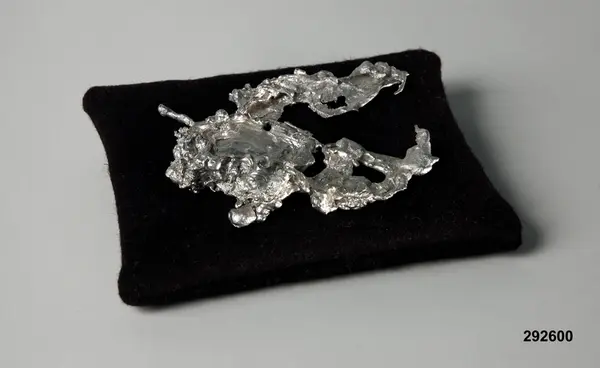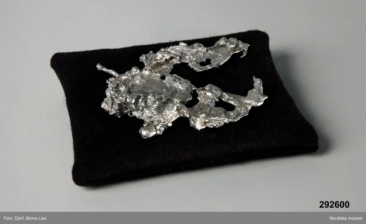 "Tenn, stöpt, folkmedicin; gjutits av givaren över en kvinna. Mått 9,5 x 7 cm. Gåva 2/9 1974 av Herr Erik Kvarnström, Skinnskatteberg."