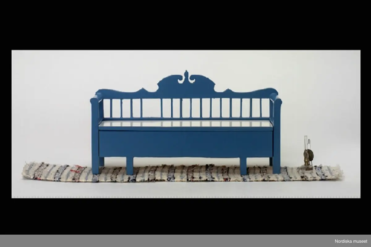 Inventering Sesam 1996-1999: a) Fotogenlampa (att hänga på vägg). Oljehus och lampglas av plexiglas, brännare och ställbar reflektor av mässing. Tillverkad av Berith Bergströms medhjälpare. H 3,7 cm, Diam 1,2 cm. b+) Utdragsoffa av blåmålat trä, med löst lock och fungerande utdrag. Rygg- och armstöd med vertikala spjälor (en spjäla i ryggstödet fattas). Konturerat och uppdraget krön på ryggstödet. Korta och fyrkantiga ben, fyra på soffan och två på utdraget. Löst vitmålat lock. Stämplat på bakstycket "NOLBYN / BB/ Värmländskt hantverk". Tillverkat av Berith Bergström. c) Trasmatta. Randig i blått, vitt och rött, frans i ändarna. Vävd av Berith Bergström. L 31,5 cm, B 5,5 cm. Tillhör dockskåp inv.nr 298.529, (köket) Berith Bergström, Stockholm, ritade och tillverkade dockskåpsinventarier från 1930-tal till 1960-tal under namnet "Nolbyn". Bergström hade en affär "Värmländskt hantverk" på Sibyllegatan, Stockholm. Föremålen är tillverkade efter svenska förebilder i skala 1:10. Dockskåpet brukat av systrarna Christina (f 1948) och Margareta (f 1949) Hofman-Bang i Djurholm, döttrar till givarinnan. Bilaga; uppgifter om tillverkaren. BR Juni 1976 Leif Wallin okt 1997
