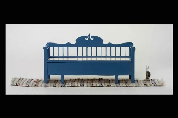 Inventering Sesam 1996-1999: a) Fotogenlampa (att hänga på vägg). Oljehus och lampglas av plexiglas, brännare och ställbar reflektor av mässing. Tillverkad av Berith Bergströms medhjälpare. H 3,7 cm, Diam 1,2 cm. b+) Utdragsoffa av blåmålat trä, med löst lock och fungerande utdrag. Rygg- och armstöd med vertikala spjälor (en spjäla i ryggstödet fattas). Konturerat och uppdraget krön på ryggstödet...