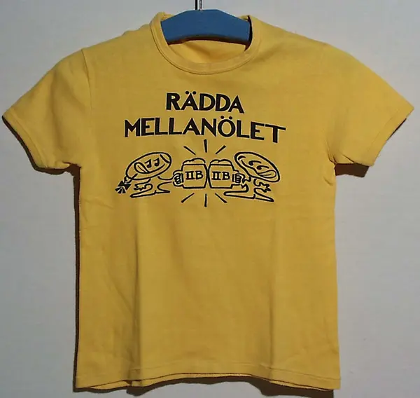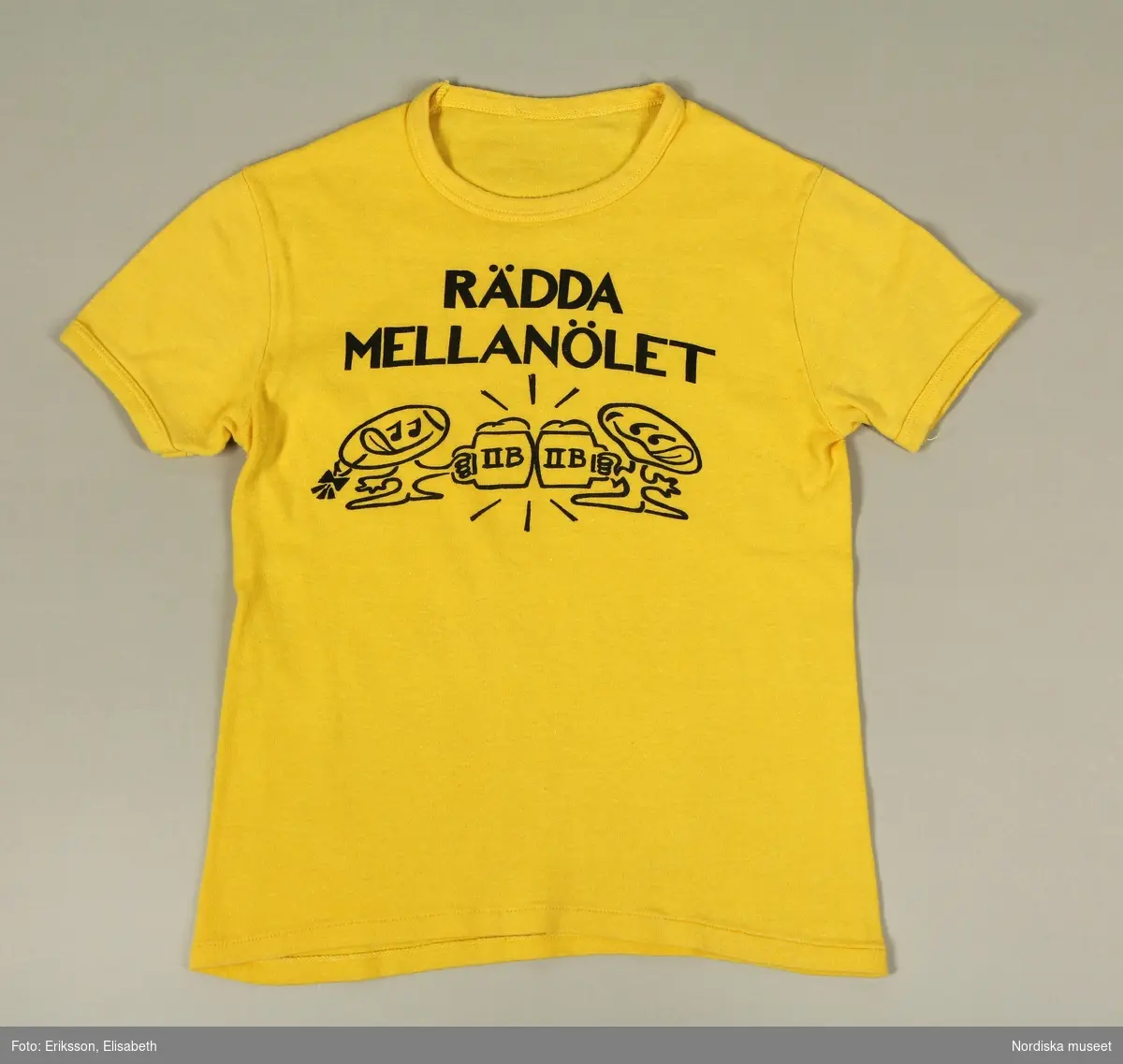 "Tröja f. man, bomullstrikå, maskinsömnad, tryck. Rak rundringad tröja, s.k. 'T-shirt' av gul rundvävd bomullstrikå med kort ärm. Tryckt text och bild i svart färg, på bröstet 2 figurer som skålar med varsin ölsejdel med beteckningen IIB samt däröver texten: 'Rädda mellanölet'. På ryggen står: 'IIB or not to be'. Trycktes av SMP-tryck i Blackeberg för pubar och andra ölutskänkn...