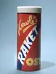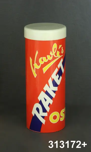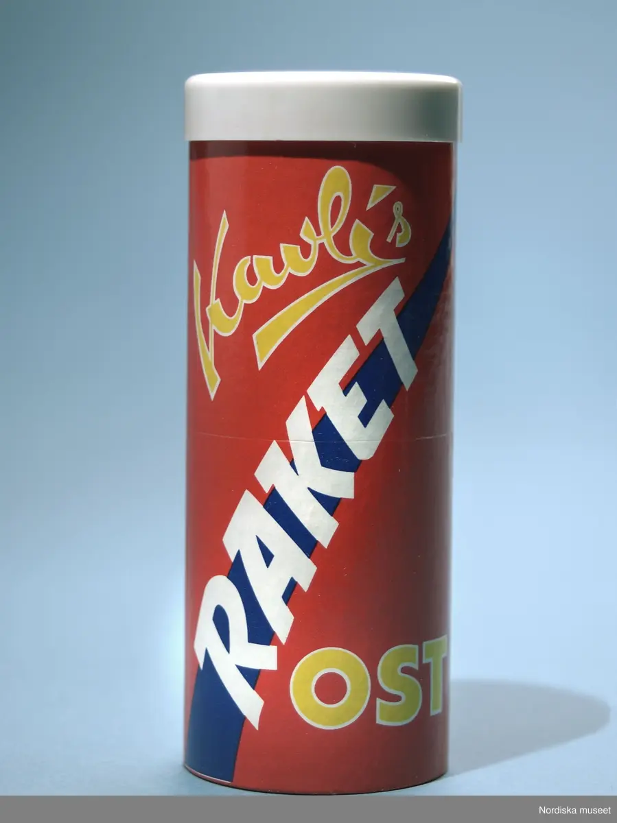 Katalogkort: "Burk (oanvänd) för mjukost, Kavlis Raketost, av papp med foliebelagd insida. Skjutbar botten av papp med vaxad utsida. Lock av vit plast, inuti ligger ett löst lager aluminiumfolie (kallas för oblat). I överkanten är fastknutet ett ca 18 cm långt tvinnat vitt bomullssnöre. Röd utsida med tryckt gult, vitt och blått. Text i gult ruta: "1. Kavlis Raketost är en mjukosttyp med fastare koncistens och med ren sötmjölkssmak. Den är utmärkt lämplig för blant annat ostkex eller mindre sandwiches. 2. Genom pressning uppåt av tubens botten framskjutes osten. 3. Vidhängande tråd brukas som kniv. Ostskivornas tjocklek kan varieras efter önskan. 4. Sedan tubens botten framskjutits över den markerade mittlinjen, bör tuben avskäras med vass kniv eller brödsåg. Smältost. U 311 27+ c:a 260 g." Under rutan "O. KAVLI A.-B. STOCKHOLM". Vid överkanten tryckt "SATELLO BURK ÅKERLUND & RAUSING"."