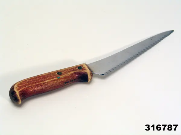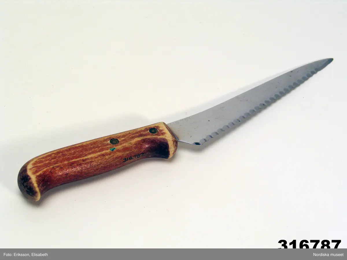 "Brödsåg, rostfritt stål, trä, nitad, lackad. Nitat handtag med greppurtag, smalnande, spetsigt vågtandat blad. Tillvstpl: KN Sweden. Anv -1991 av fam Magnusson, Vg, Björkäng sn, Töreboda. L 29 cm B 3 cm. KU 12205. Lackskiktet borttvättat, sprucket skaft. I[nköpt] 31/5 1991 [från] Lilian och Kjell Magnusson [...] Töreboda jämte 316.115 - 317.023 63 000:- för saml. [Brukningsort:] Vä...
