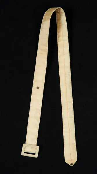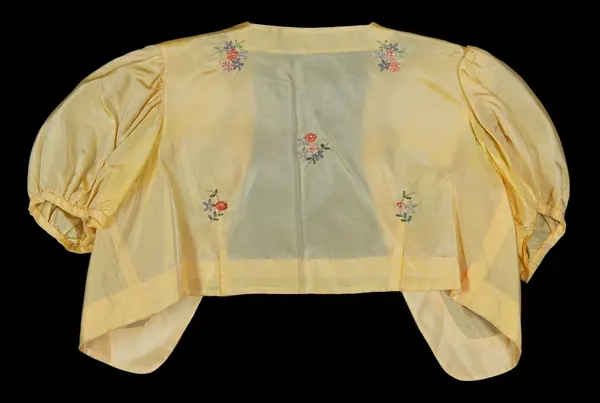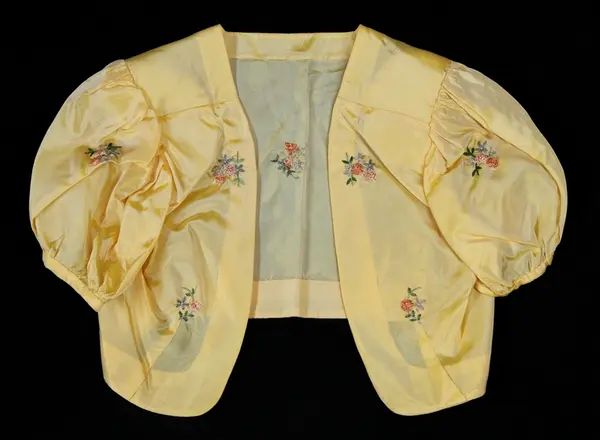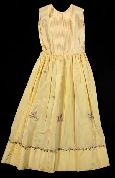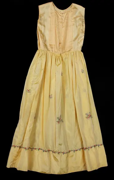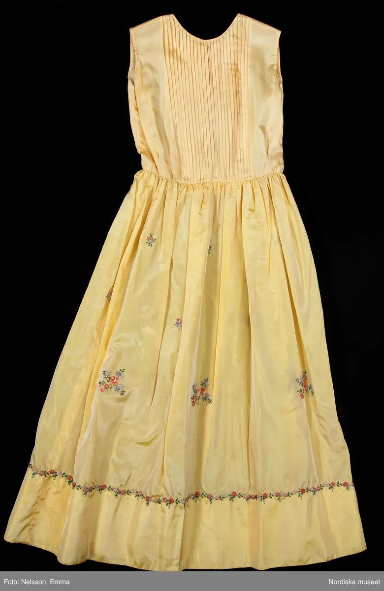 Katalogkort: "Klänning med bolero för tonårsflicka av gul konstsidentaft (livet i något ljusare nyans) m. broderi i form av strödda blommor + bård nedtill i rosa, blått o. grönt brodérsilke. Klänning. Avskuren i livet. Ärmlös. Livet sytt av 1 fram- o. 1 bakstycke. Plisserat mittparti både fram o. bak. Rundringad hals m. slå av tyget. Knäppning vid halsen o. i midjan bak m. tryckknappar. Kjolen består av 1 fram- o. 1 bakvåd, rynkad mot midjan. Ärmlappar av vit organza, vars gummering har torkat. En 15 cm bred skoning nedtill på kjolens insida. Bolero. Bestående av 2 framstycken + 1 bakstycke. Isydda korta puffärmar. Framkanten rundad nedtill. Framflyttad axelsöm. Midjeinsyningar. Tillhörande skärp av sidenrips i samma nyans som klänningen. Överklätt rektangulärt spänne. Skärpänden m. tryckknapp."