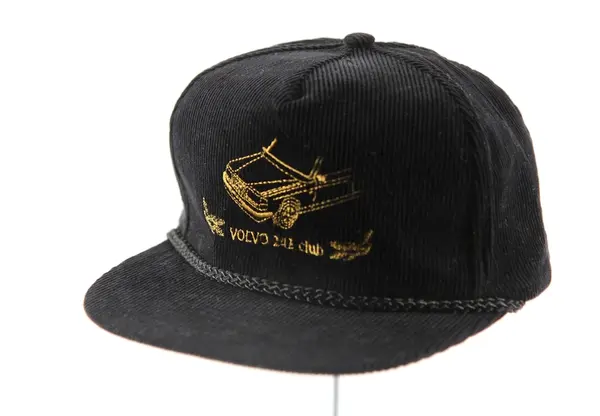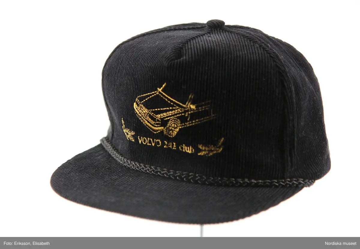 Katalogkort: "Skärmmössa, bilklubbsmössa. Material: bomull Teknik: maskinsydd, konfektion Tillverkningstid: 1990-tal Tillverkningsort: Kina Brukningstid: 1990-tal, fabriksny Brukningsort: Solna Brukare: Volvo 242 Club Längd 26 cm, bredd 20,5 cm Skärmmössa i svart manchestersammet. Kullen sydd av 6 kilar, skärmen sstyv, klädd knapp mitt på kullen. I pannan broderi i gult: bil (halv) sedd snett framifrån. Text 'Volov 242 club' med grankvist på var sida. Svart konstfibersnodd vid sömmen mellan skärm och kulle. I mössan vit lapp med texten 'Fashion Cap. 100% bomull. Made in China. Hestra Reklam 0370-352 80'. Bilklubben 'Volov 242 Club bildades 1991 och hade år 1996 ca 50 medlemmar. Klubben har sitt ursprunsäte i Solna, men har även adress i Rosshyttan VÄ [Västmanland]. Se bilklubbsdokumentationen D404:97. Ulrika Heinonen okt. 1999. G. 1999.03.30 Volvo 242 Club, Lindahl, Råsundav. 77, 171 37 Solna."