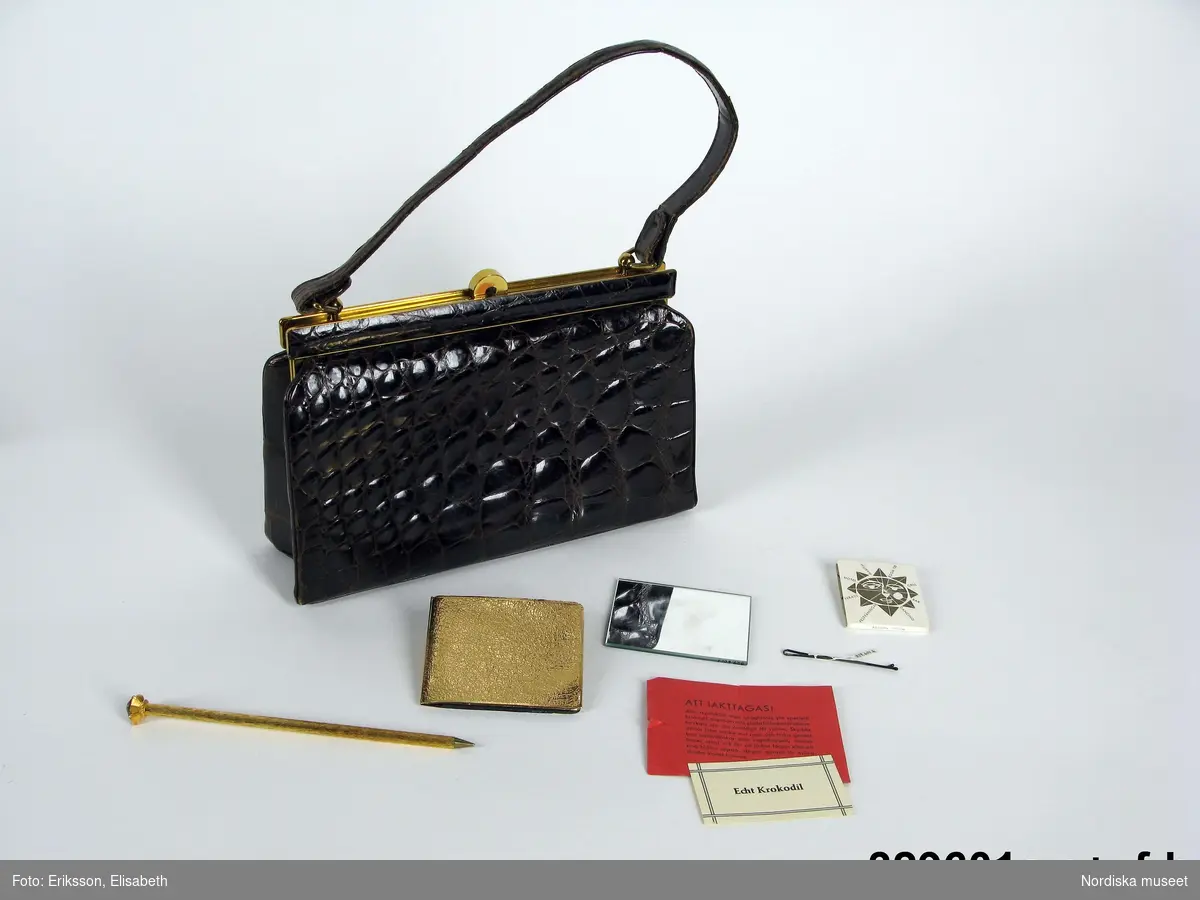 Handväska med innehåll (a-h). a) Handväska av brunt krokodilskinn. Rektangulär modell med rak bygel av mässing och snäpplås. Handtag av skinnet. Fodrad med brunt mockaskinn samt brunt kalvskinn och gulbrunt siden och inredd med ett blixtlåsfack, ett mindre fack för medföljande spegel samt ett större fack. b) Tryckt vit papperslapp med text "Echt Krokodil". L. 7,3 cm. c) Tryckt röd papperslapp med text "ATT IAKTTAGAS..." med text om att väskan är känslig för vatten. Vikt på mitten. L. 9,7 cm. d) Penna, Kulspetspenna av guldgul metalll med ojämnt yta. upptill infattad röd glassten. L. 17.3 cm. e+) Telefonbok av papper i löst omslag av guldfärgad plast. På insidan av omslaget text "FEBE DAMKONFEKTION / INEX HOLM / S:t Eriksgatan 103. Tel. 33 56 10". Teleonboken har bokstavsflikar. Oanvänd. L. 8 cm. f) Fickspegel. Spegelglas på bägge sidor. L. 7,8 cm, B. 5,6 cm. g) Tändsticksplån, av papp nervikt flik, inuti tändstickor av svart papp. Tryckt på framsidan en stiiserad sol med text "ROOM 100 / GRILL / BAR / DANCING / FESTVÅNINGAR / TRESASS / HOTEL / MARITIM." På baksidan "Strand / STOCKHOLM 22 28 20" samt handskrivet "7131 / 7137 ". Inuti "Strands Terass / restauranten på toppen / Maritim / STRAND DANCIN / NIGHT CLUB - AMERIKAN BAR- / Vi arrangerar bröllop, familjehögtider samt jubileer affärsmåltider i samband med sammanträden och konferenser frimafester cocktailparties pressmottagningar och visningar / för mindre sällskap - room 100 / restaurantreceptionen 22 28 20". Undertill "Novaco Halmstad". L. 5,3 cm. h) Hårnål, enkel av metall, brun. L 6,3 cm. Handväskan var en gåva till åkeriägarhustrun Ingrid Jansson, f. 1912, i femtioårsgåva från syskonen. "Använd till fint tillsammans med en röd, långärmad klänning eller en cerisröd klänning med kortrynkad ärm och fyrkantig ringning. Ingrid Jansson var en kraftig kvinna." (Givarens komm.Givaren sonhustru till Ingrid Jansson.)Hon var hemmafru mesta tiden men arbetade en kort tid som växeltelefonist. Maken startade åkerirörelse kring 1960 och ingick i Solna förenade åkare. Ingrid jansson avled 2004 vid 92 års ålder. Väskan uppskattas av hennes son ha använts under tio års tid vid speciella högtidligheter. En handväska av krokodilskinn var till fram emot 1970-talet en statussymbol och mycket eftertraktad av kvinnor. Pga sin dyrbarhet blev den gärna en gåva vid speciella tillfällen som t.ex femtioårsdagen eller som julklapp från make eller beundrare. Intresset för krokodilhandväskor har avtagit avsevärt sedan Sverige antog Konventionen om internationell handel med utrotningshotade djur, 1975. Idag finns farmer för odling av vissa krokodilarter vars skinn går till handel. /2008-09-08 Ingrid Roos