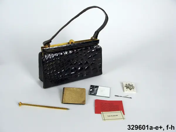 Handväska med innehåll (a-h). a) Handväska av brunt krokodilskinn. Rektangulär modell med rak bygel av mässing och snäpplås. Handtag av skinnet. Fodrad med brunt mockaskinn samt brunt kalvskinn och gulbrunt siden och inredd med ett blixtlåsfack, ett mindre fack för medföljande spegel samt ett större fack. b) Tryckt vit papperslapp med text "Echt Krokodil". L. 7,3 cm. c) Tryckt röd papperslapp me...