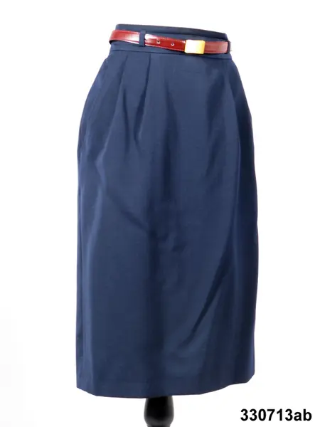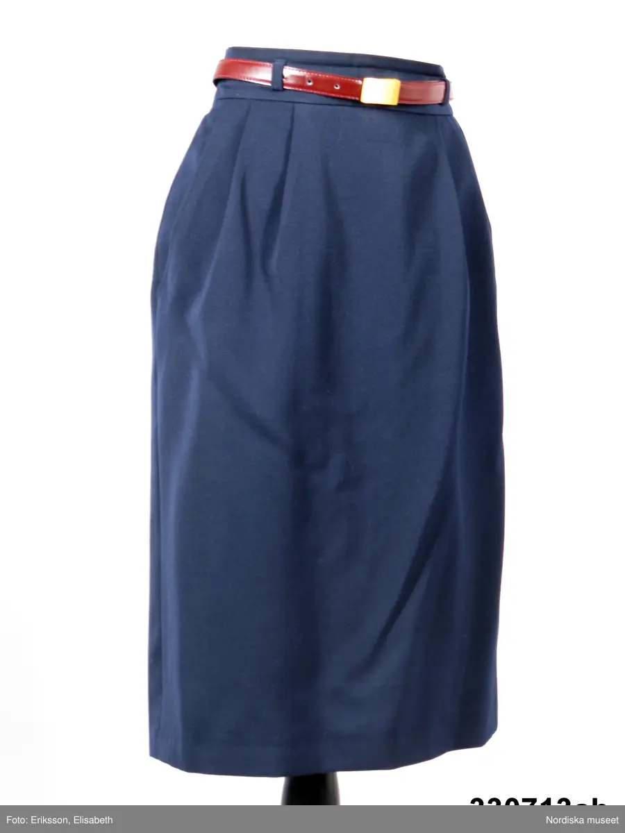 Kjol. Mörkblå ull/polyester. Rak modell med gångveck bak och fram fyra lagda lösa veck mot midjan samt snett inskurna fickor. Lätt bred linning med stickningar, skärphällor och ett iträtt skärp av vinrött konstläder (troligen) samt med mässingsspänne. Söm mitt bak med blixtlås, insnitt mot midjan. Vidsydda tygetiketter: "Calvin Klein exclusively for SAS" samt "Johan S." och material + tvättanvisni...