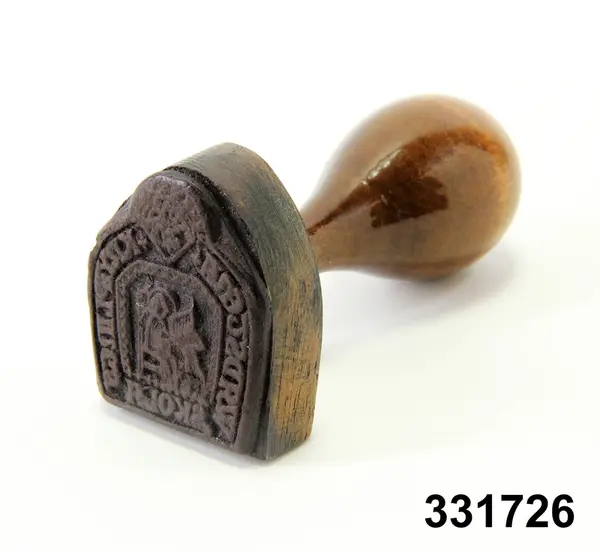 Stämpel med svarvat brunlaserat skaft. På stämpelplattan bild av sittande kvinna med öppen bok och textfält runtom: Wadstena Knypplings skola. /Berit Eldvik 2013-03-19