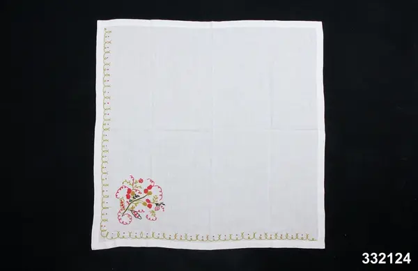 • Halsläde av fin linnelärft sk. näsdukslinne. Stilistiskt broderi i blommor och bladslingor med kedjestygn i färderna senapsgult, rödrosa och mörkbrun ylletråd. Broderad bård på två sidor och ett motiv med blommor och blad i hörnet där dessa möts. Halsklädet viks i tresnibb vid användning. Fållen mäter 2,5 cm.