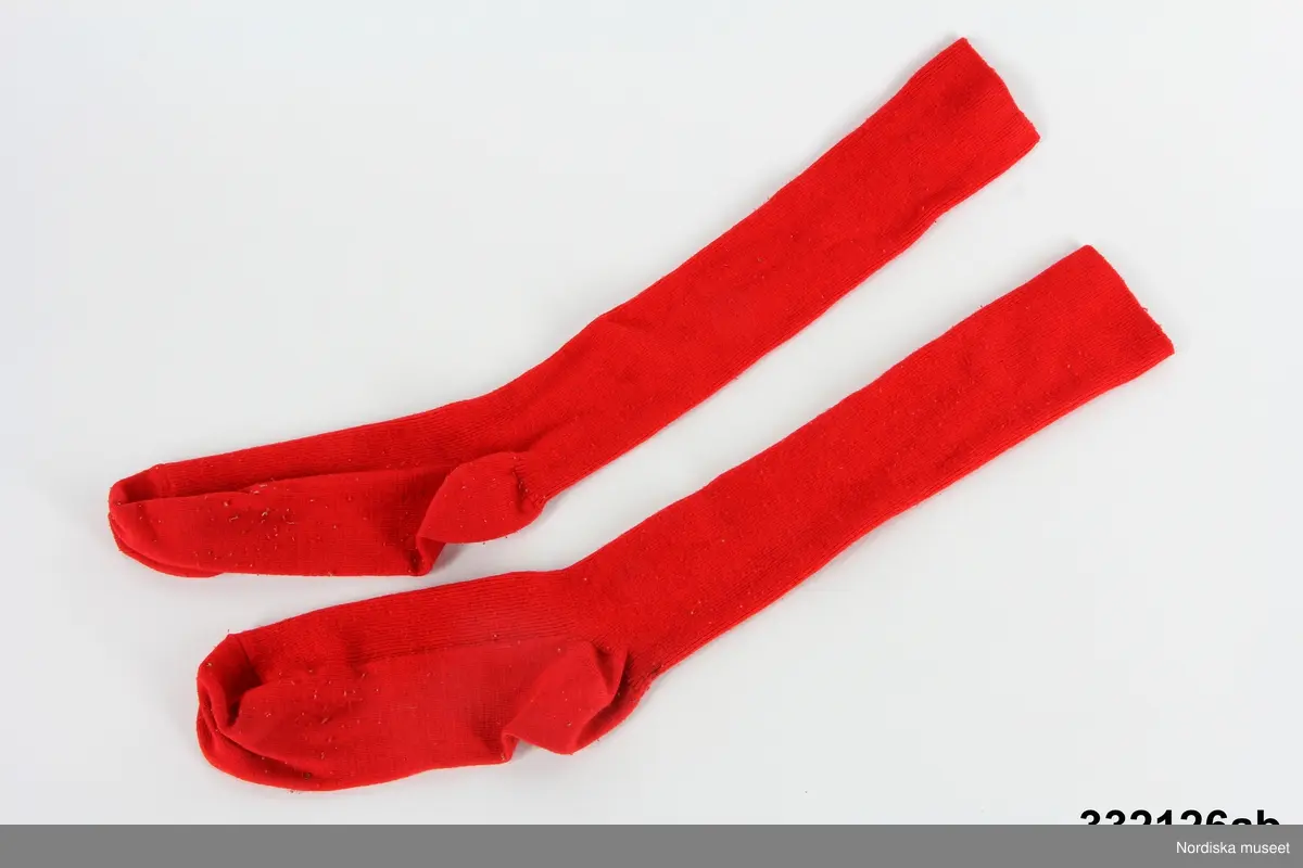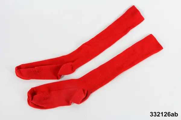 • Ett par röda knästrumpor som är maskinstickade i trikå i materialen bomull och syntet.