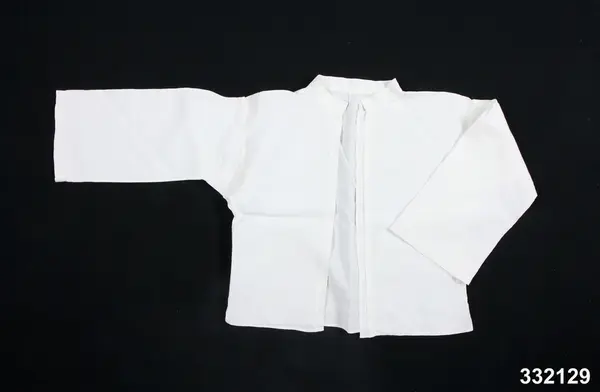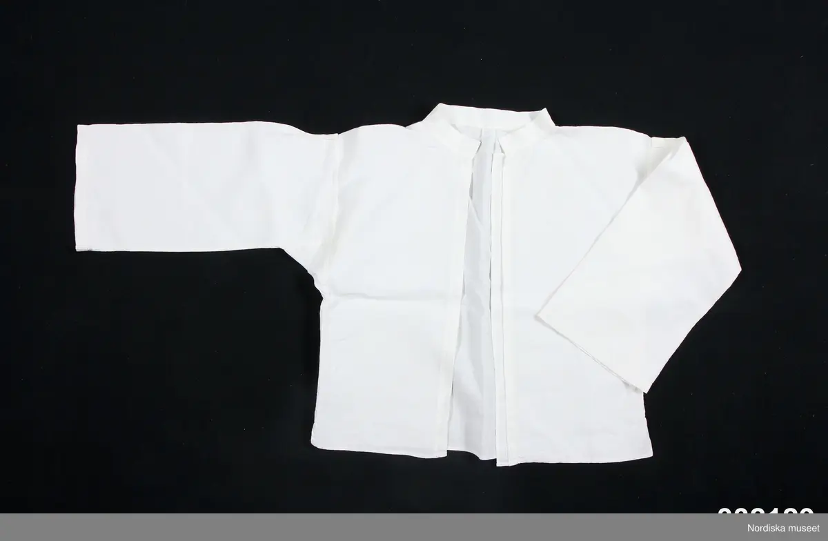 • Blus/överdel, vitt linne, tuskaft. Helt bakstycke, två framstycken, slitsar nedtill i sidsömmar, helt öppen framtill (utan knäppning), låg ståkrage, raka vida ärmar med ärmspjäll, täta sydda veck på ärmens ovansida vid axeln,