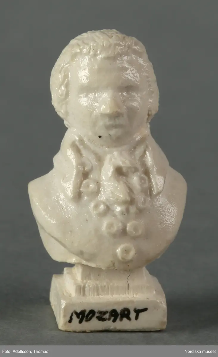 Byst föreställande kompositören Wolfgang Amadeus Mozart, tillverkad av vit konstmassa. Prydnadsföremål som står på en av bokhyllorna (nm.0333227 a-e) i dockskåpets bibliotek, andra våningen. Signerad ...