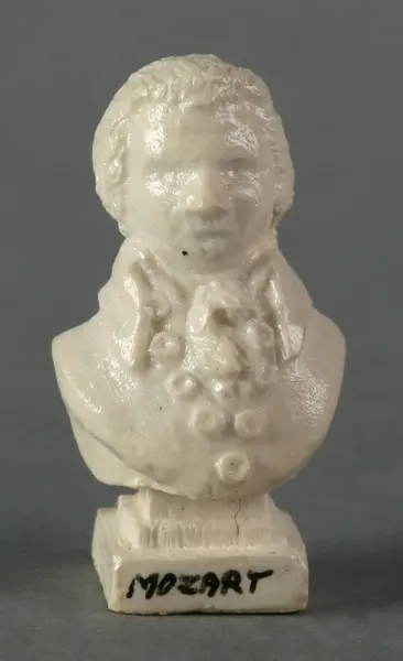 Byst föreställande kompositören Wolfgang Amadeus Mozart, tillverkad av vit konstmassa. Prydnadsföremål som står på en av bokhyllorna (nm.0333227 a-e) i dockskåpets bibliotek, andra våningen. Signerad M G Alford.