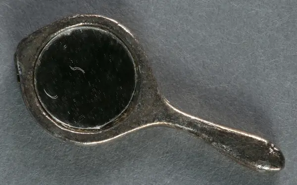 Sex toalettartiklar bestående av a) handspegel, b) borste, c) kam, d) rakkniv, e) Nivea hudkräm och f) löständer. Hör till inredningen i föräldrarnas sängkammare på andra våningen i dockskåpet. Ska li...