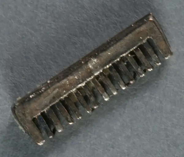 Sex toalettartiklar bestående av a) handspegel, b) borste, c) kam, d) rakkniv, e) Nivea hudkräm och f) löständer. Hör till inredningen i föräldrarnas sängkammare på andra våningen i dockskåpet. Ska ligga på toalettbordet (NM.0333251).