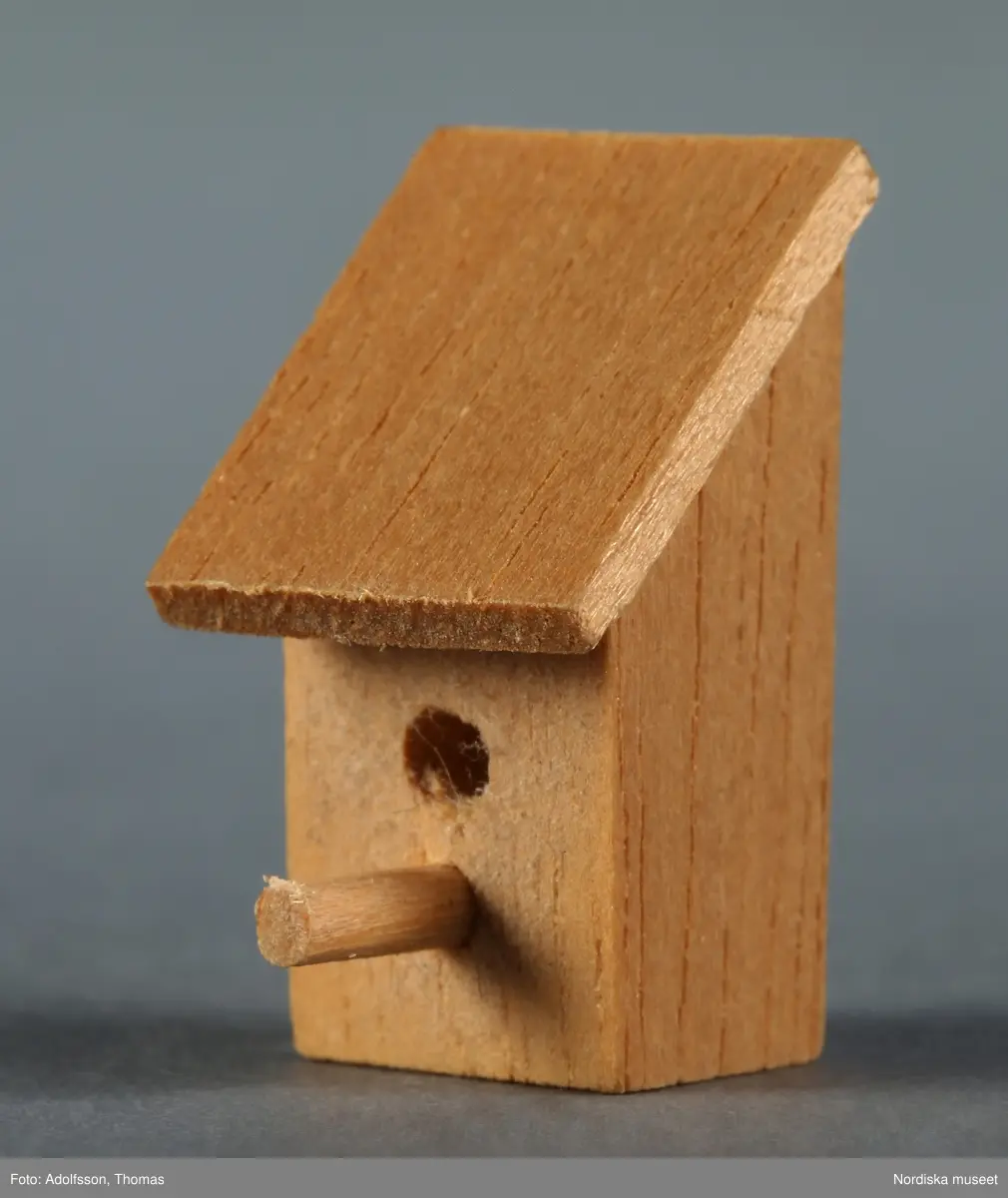 Fågelholken hör till trädgården utanför dockskåp NM.0331721+. På 1960-talet var det vanligt att barn, som en av de första uppgifterna i lekskolan eller träslöjden, fick tillverka enkla fågelholkar att sätta upp i träden för småfåglar. Dockskåpet är tillverkat av givarens far i början av 1970-talet och avbildar familjens hem som det såg ut med inredning och allt, när de mellan åren 1960-1978 bodde i en villa i Nockeby. Huset byggdes på 1930-talet och finns fortfarande kvar. Det har källare, vind, två våningsplan och en liten trädgård. Pappan, som på den tiden var vice VD för Johnsonkoncernen, ägnade all sin fritid åt samvaro med sin förståndshandikappade son. Sonen älskade att leka med husmodellen som pappan byggt och behöll den livet ut som ett kärt minne. För honom hade hemmiljön stor betydelse och han tyckte om att varje sak fanns på rätt plats. Dockskåpet kom att spela en viktig roll i kommunikationen mellan dem.