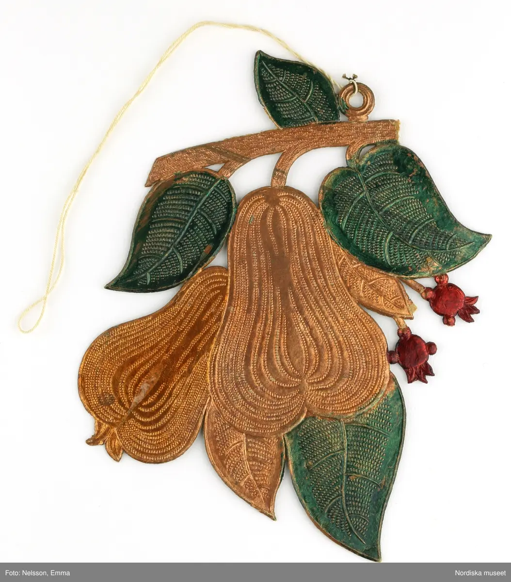 • En köpt julgransprydnad av metallicfärgad papp i form av en arrangemang med frukter och blad, med upphängningsanordning av vit tråd.