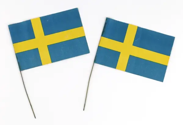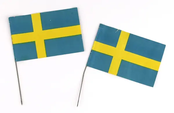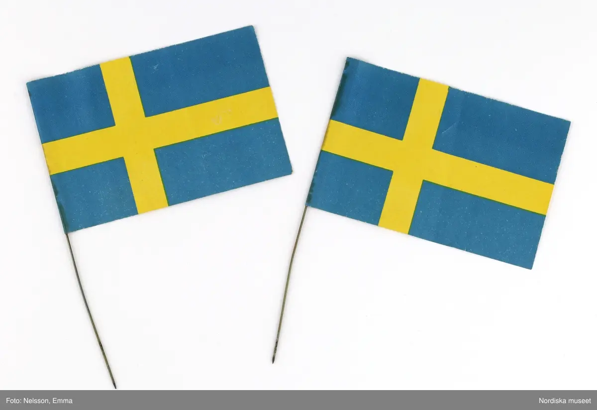 • Fyra stycken (a-d) julgransflaggor föreställande den blå-gula svenska flaggan. Två stycken var placerade på var sida om julgranens topp. Av papper med metallstång som fastsättningsanordning.