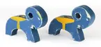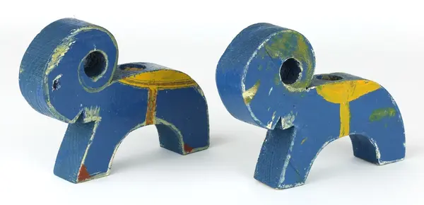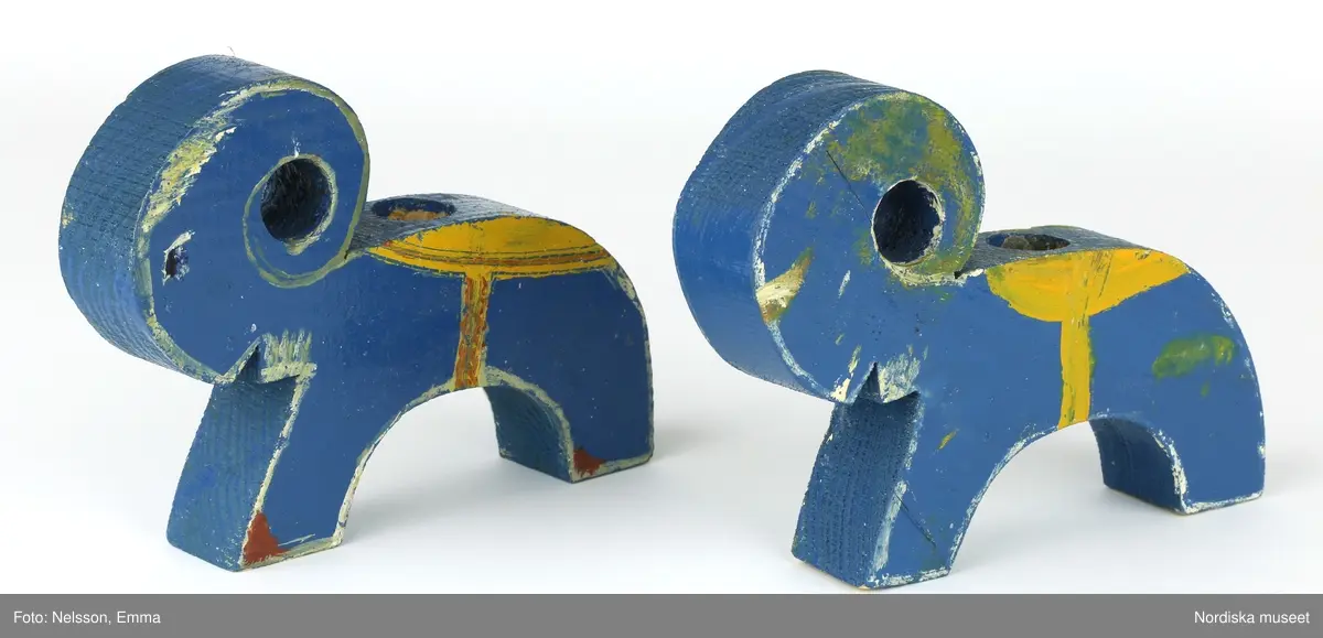• a-b) 2 stycken blå julbockar/julljusstakar av trä. Tillverkade av givarens mamma och morfar. Halvfabrikat beställdes från Panduro och målades sedan i hemmet.