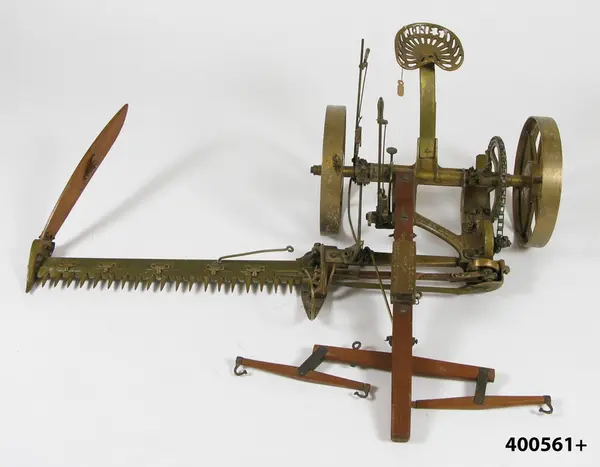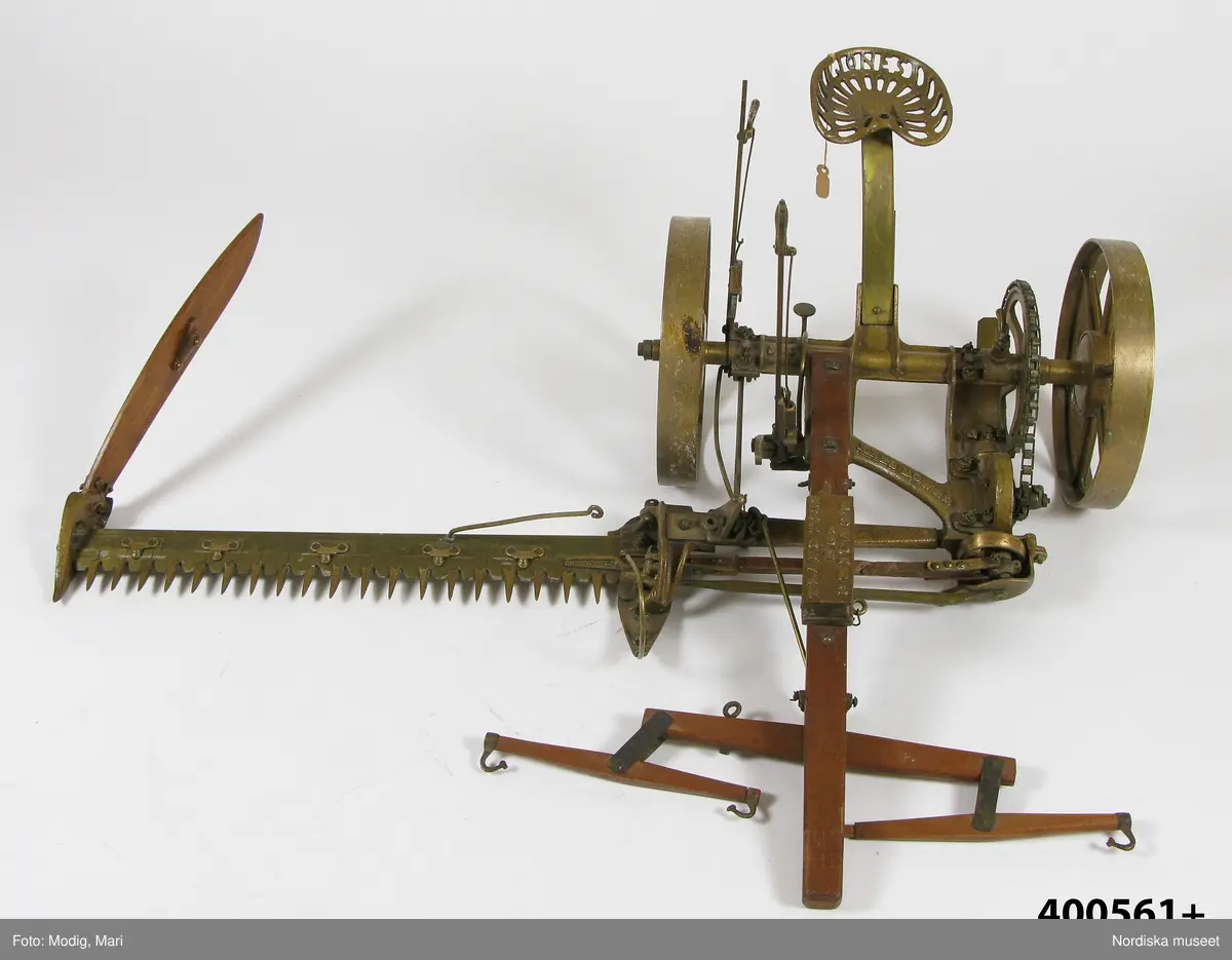 "LM 561. Jone's kedjeslåttermaskin. Modell. Yngre amerikansk typ för två hästar. Körhjul med spärrhakar i dosor. Rörelsemekanismen: en kedjeutväxling och en konisk kuggväxel, skärapparat med 19 fingrar och två ställbara släpskenor, stråförarspröt, fast renskäpp, körsits på fjäder, tistelstång med våg och gjuten verktygslåda. Tillverk. The Plano MFg. Co, West Pullman, Chicago. Skala 1:...