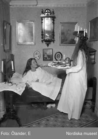 • Luciamorgon. Lucia med ljuskrona och kaffebricka lussar för flicka i säng. Filipstad, Värmland.